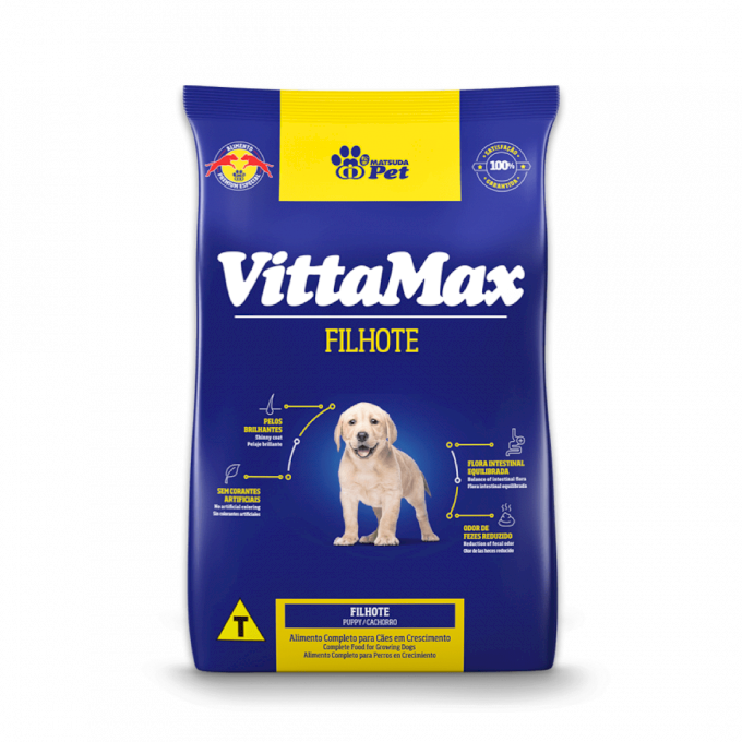 VittaMax Filhote é um alimento Premium Especial da Matsuda Pet. É elaborado com ingredientes de qualidade, sua fórmula palatável e equilibrada proporciona um crescimento saudável, satisfação e beleza de seu filhote.